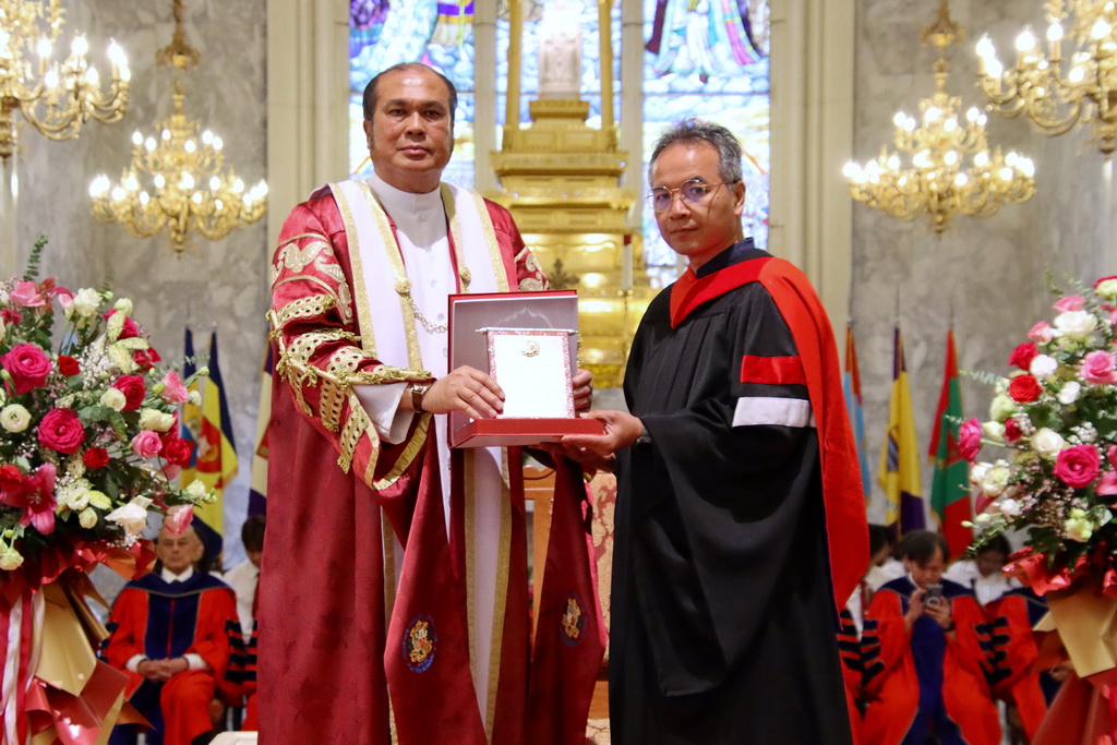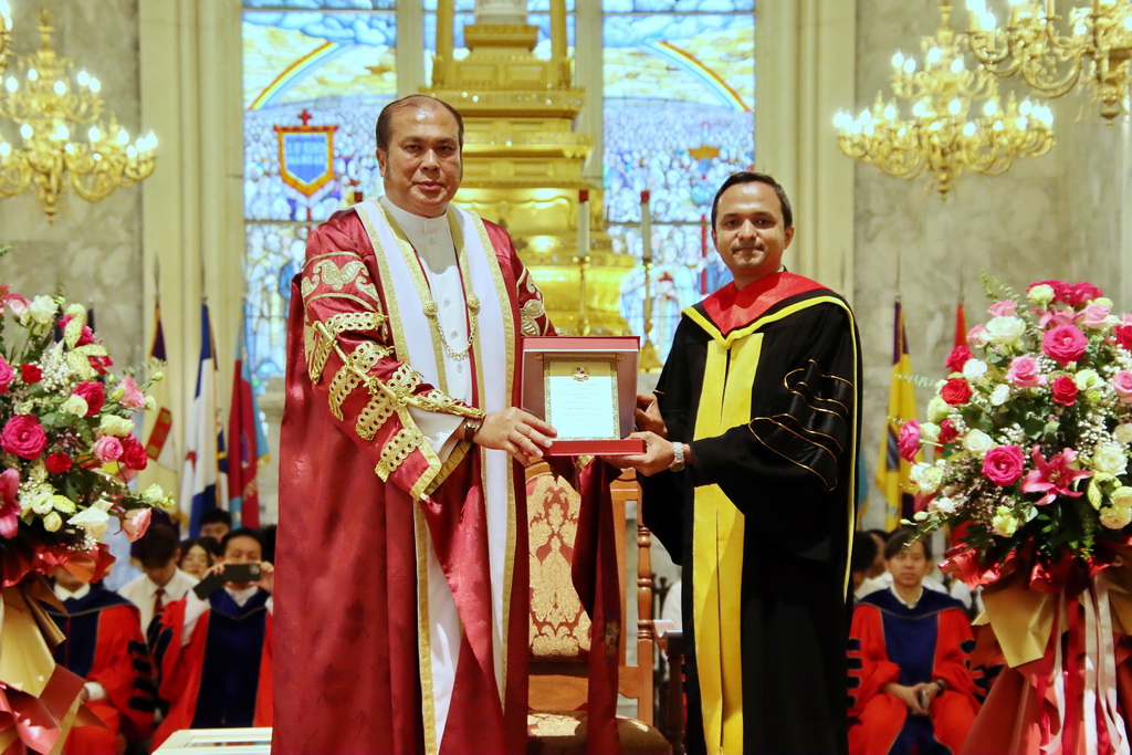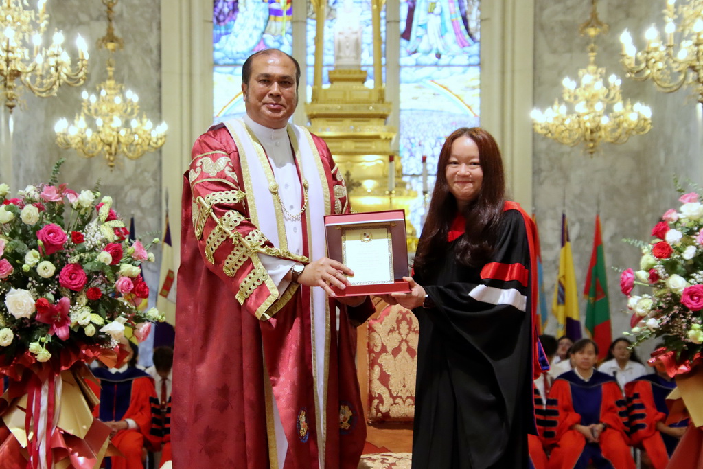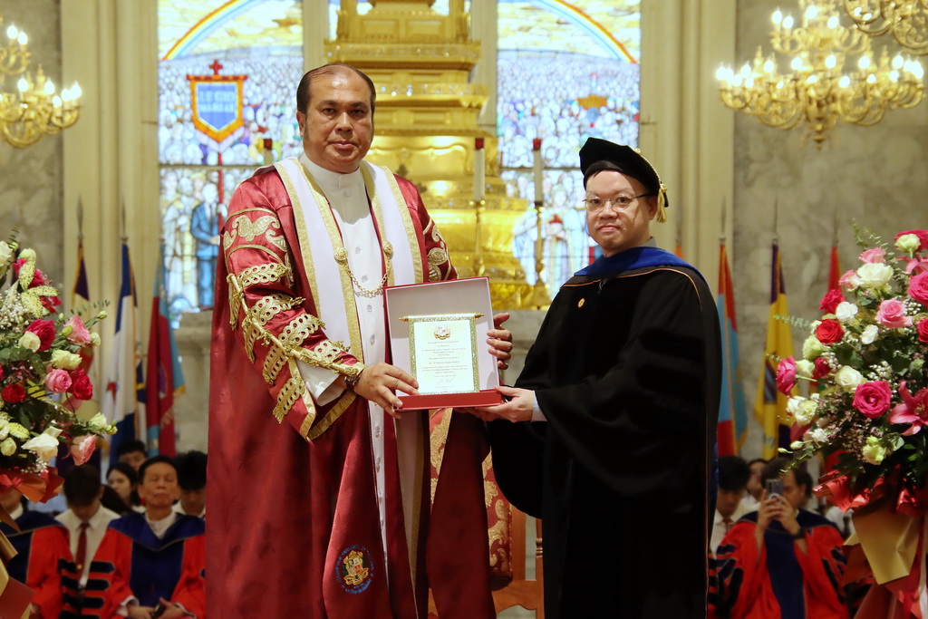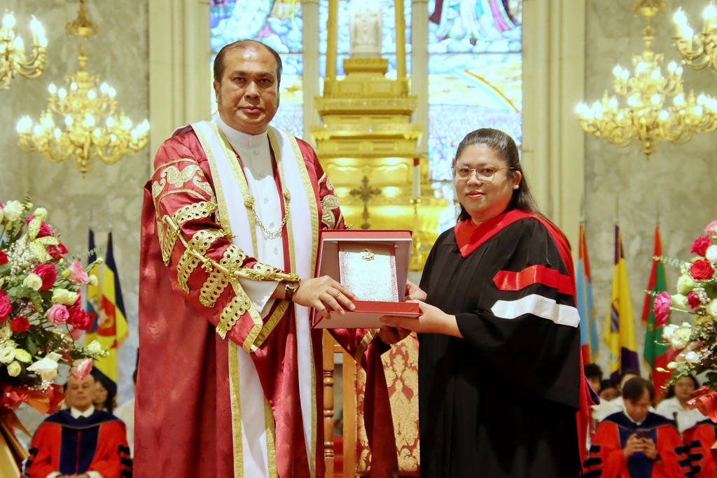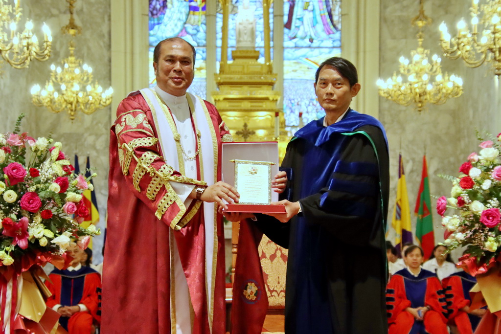 The St. Michael Award for Public Service, honoring individuals whose work extends the university’s mission into society, was conferred upon Asst. Prof. Dr. Vasa Buraphadeja and Dr. Sarina Preechalert. Their contributions, spanning digital innovation, artificial intelligence literacy, and financial education, have reached schools, government agencies, and communities across Thailand and the ASEAN region, strengthening public capacity and social well-being.