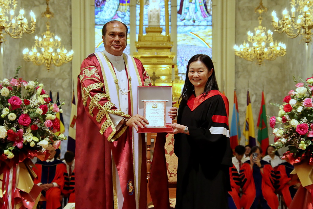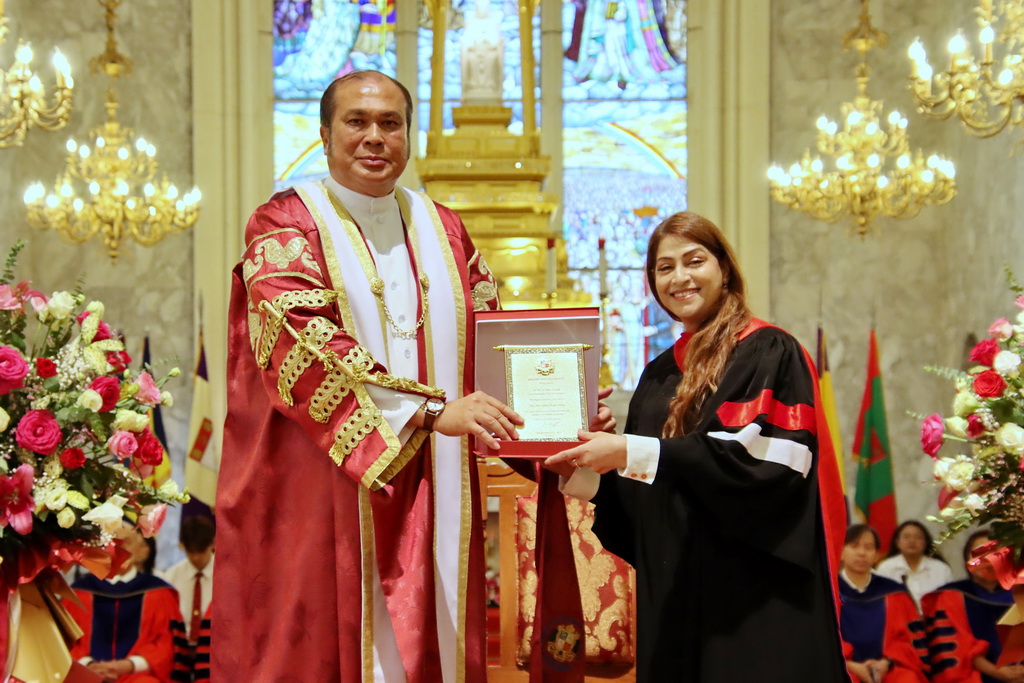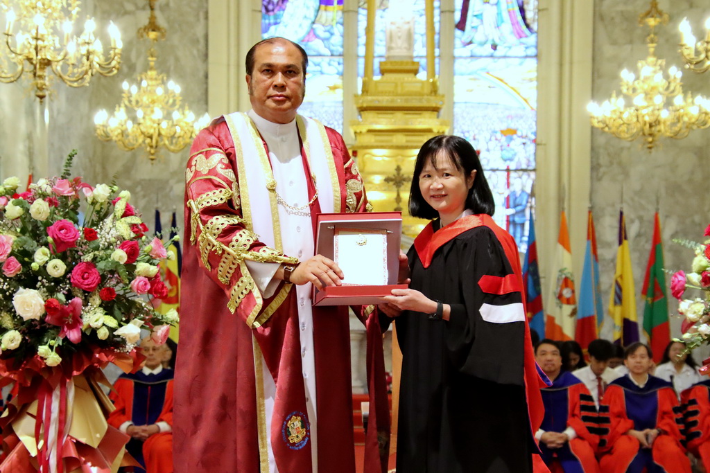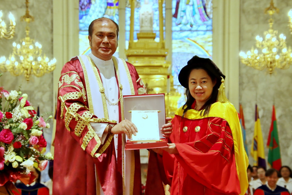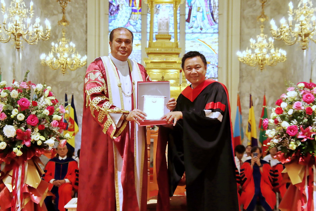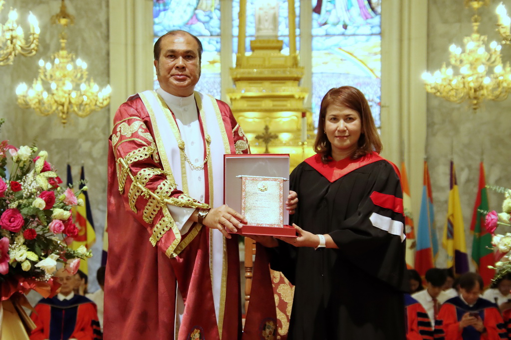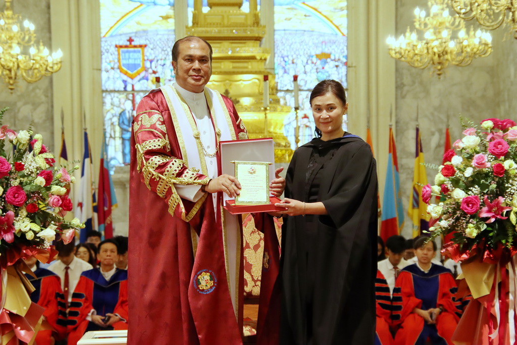 The St. Michael Award for Public Service, honoring individuals whose work extends the university’s mission into society, was conferred upon Asst. Prof. Dr. Vasa Buraphadeja and Dr. Sarina Preechalert. Their contributions, spanning digital innovation, artificial intelligence literacy, and financial education, have reached schools, government agencies, and communities across Thailand and the ASEAN region, strengthening public capacity and social well-being.