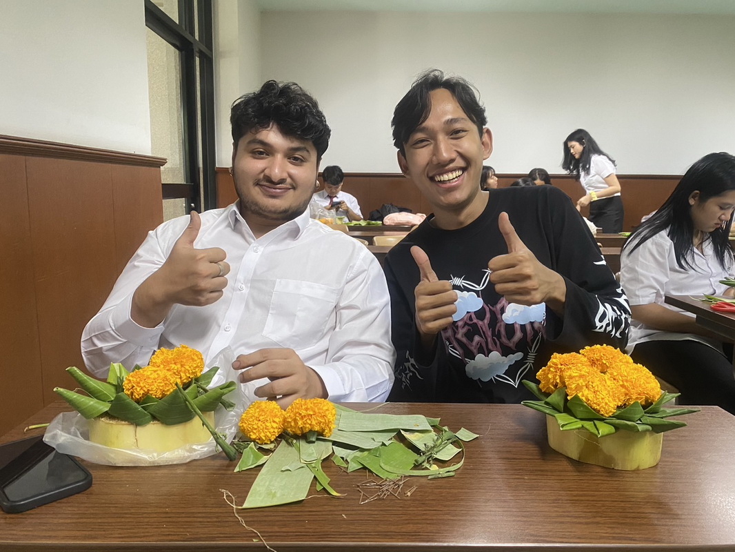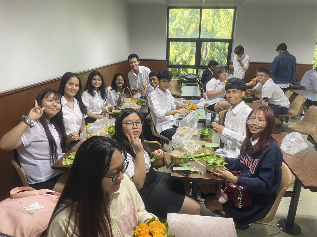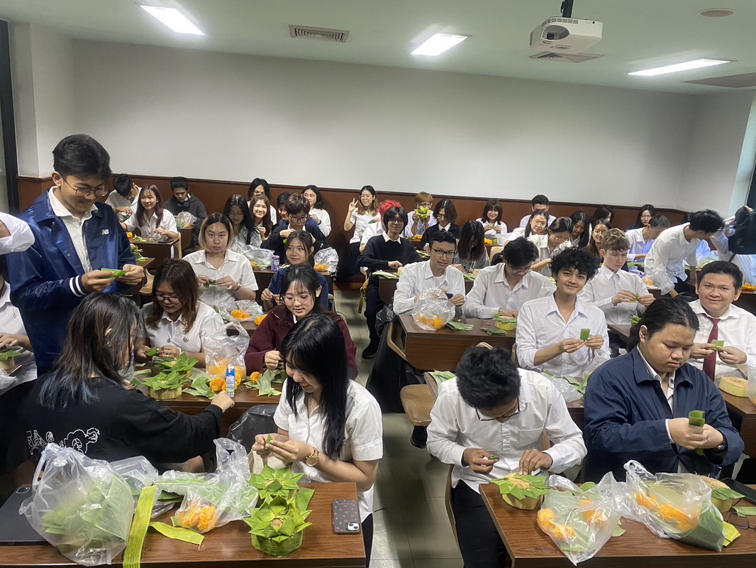 At Assumption University of Thailand (AU), in a room with 60 students on the left side of the SG wing, international students taking GE 1405/1409 Thai Language and Culture this semester, 2/2024, were not just learning about Loy Krathong. They were actively involved in a unique and immersive cultural tradition of Krathong-making, a hands-on learning experience that brought them closer to Thai culture. This was a rare opportunity for international students to participate in the celebrated Loy Krathong festival, which significantly deepened their understanding and appreciation of Thai culture. The course coordinator emphasized that to speak Thai well, students must understand and adopt the cultural mindset, or ‘think like Thai. ‘ This involves understanding and respecting Thai traditions and customs, such as participating in cultural activities and festivals like Loy Krathong. Active participation in this artistic tradition made them feel more engaged and involved in learning, fostering a connection with Thai culture.