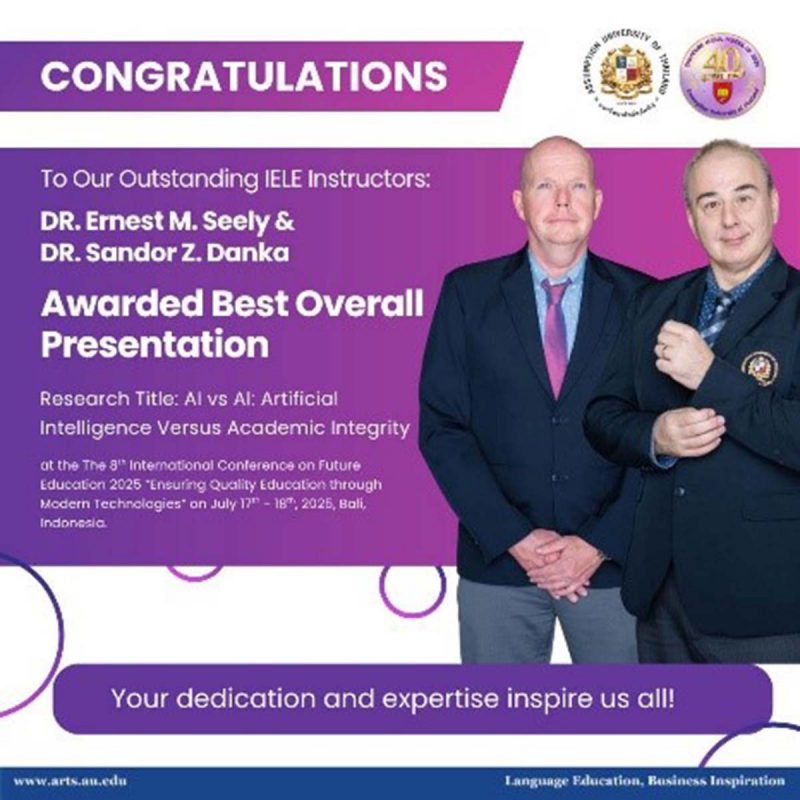 Assumption University of Thailand (AU) proudly congratulates Dr. Ernest M. Seely and Dr. Sandor Z. Danka, senior lecturers from the Institute for English Language Education (IELE), Theodore Maria School of Arts for receiving the prestigious Best Overall Presentation Award at the 8th International Conference on Future Education 2025. The conference, held in Bali, Indonesia from July 17–18, brought together educators and researchers from around the world to explore the theme “Ensuring Quality Education through Modern Technologies”.