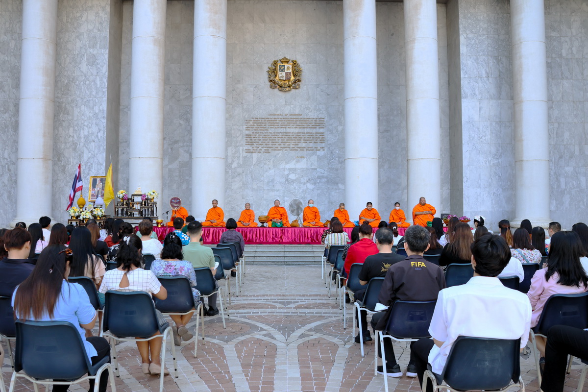 Assumption University of Thailand (AU) came together on November 13, 2024, in a quiet yet poignant almsgiving ceremony, paying tribute to His Majesty the King’s 6th Cycle Birthday Anniversary. The event unfolded in the early hours at the Sri Rattanakosin Gate, in front of the university’s CL Building on the Suvarnabhumi Campus, where faculty, students, and staff gathered in solemn reflection.