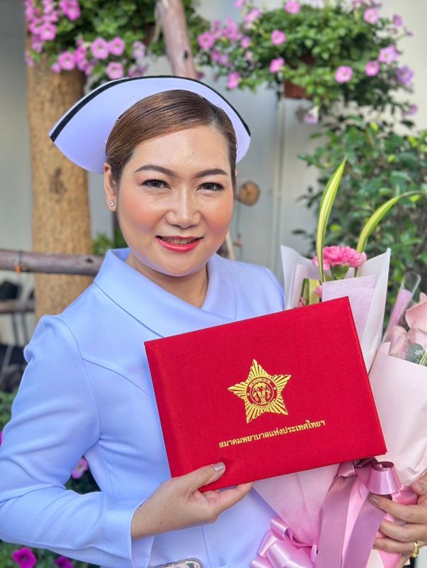 Ms. Ammara Jaemsai’s outstanding contributions include her active role as a nursing student committee member, leadership in a Blood Donation Project, and chairing an academic seminar during her studies. Today, she continues her dedication to the nursing profession as a professional nurse at the Orthopedic Center of Vejthani Hospital, where she was awarded a full scholarship throughout her four-year nursing program.