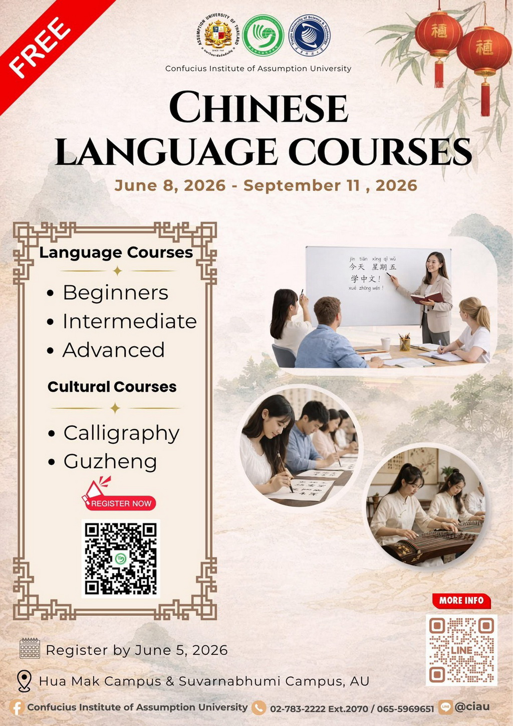 Suvarnabhumi Campus, Hua Mak Campus, Assumption University of Thailand, 88 Moo 8 Bang Na-Trad Km. 26, Bang Sao Thong, Samut Prakan, Thailand🎓 เรียนภาษาจีนฟรี!!! เริ่มเลยวันนี้! เปิดโลกใหม่กับคอร์สภาษาจีนครบทุกระดับ ไม่ว่าคุณจะเริ่มจากศูนย์ หรืออยากพัฒนาทักษะให้คล่องขึ้น เรามีให้ครบในที่เดียว 📅 ระยะเวลาเรียน: 8 มิถุนายน – 11 กันยายน 2026 🟢 Beginner | 🟡 Intermediate | 🔴 Advanced ✨ เสริมด้วยคอร์สวัฒนธรรมจีน ✍️ Calligraphy (เขียนพู่กัน) 🎶 Guzheng [...]