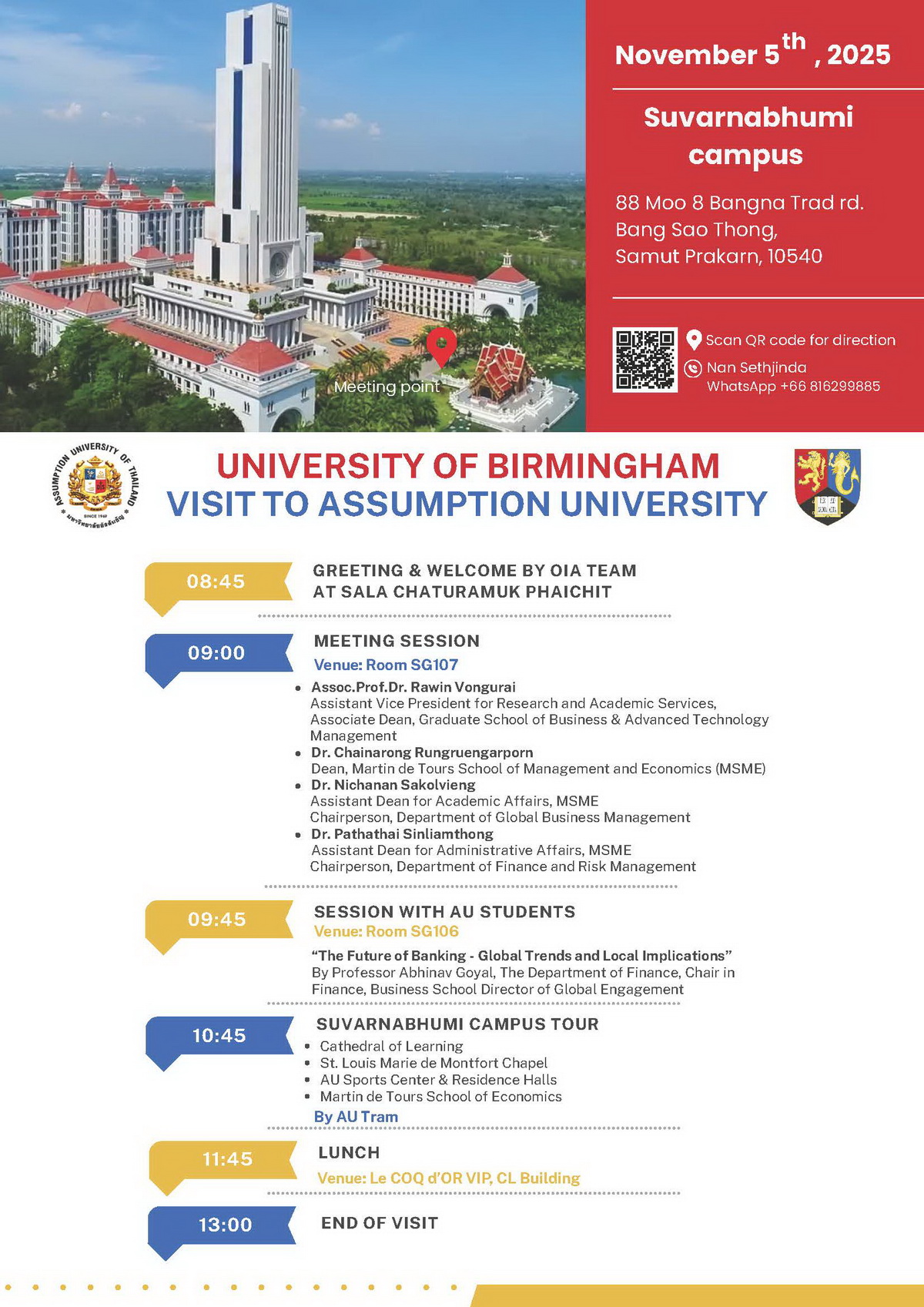November 5 @ 08:45 - 13:00 University of Birmingham Visit to Assumption University Suvarnabhumi Campus Assumption University of Thailand 88 Moo 8 Bang Na - Trad Km. 26, Bang Sao Thong, Samut Prakarn, Bang Sao Thong, Thailand