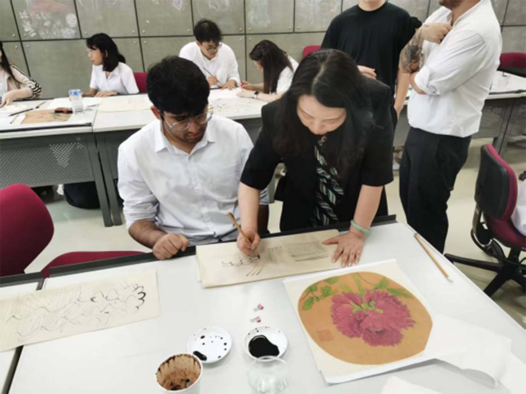 The workshop went beyond technical skills to highlight cultural meaning. Professor Zhang introduced traditional Chinese symbols—plum blossoms, orchids, bamboo, chrysanthemums, birds, and insects—explaining their artistic, seasonal, and spiritual significance.
