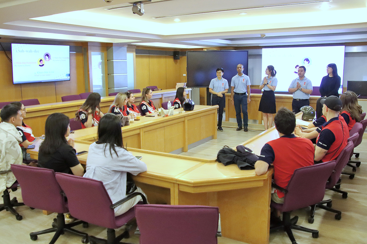 The event started at 9:45 AM with a warm welcome. Exchange students were introduced to Thai culture and language, including the traditional Thai greeting “Wai” (ไหว้), followed by an ice-breaking game where they introduced themselves in Thai. We also shared useful tips and insights to help them adjust smoothly to studying in Thailand.