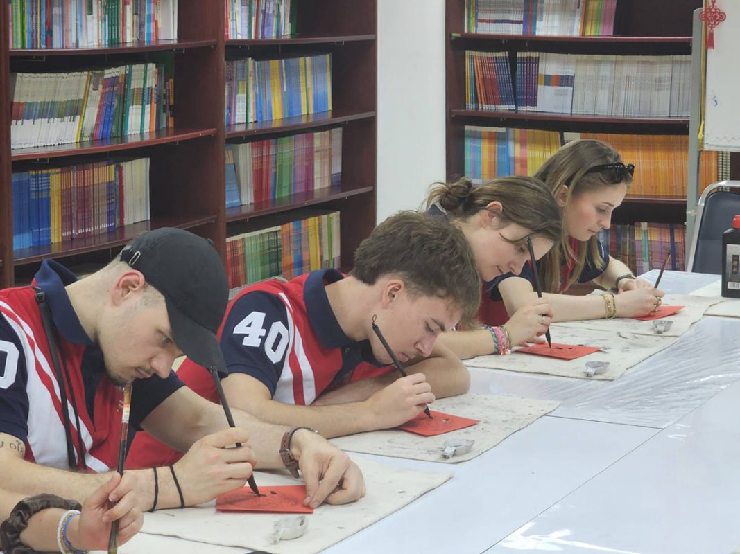 Next, we visited the Confucius Institute at AU (7th floor, CL Building), where a professor shared insights into Chinese history and culture. Students learned the art of Chinese calligraphy, practiced writing with a brush in celebration of the upcoming Chinese New Year, played traditional Chinese games, and tried the Guzheng (古筝), a classical Chinese musical instrument. By 3:30 PM, we returned to Hua Mak Campus, marking the end of a lively and enriching welcome day.