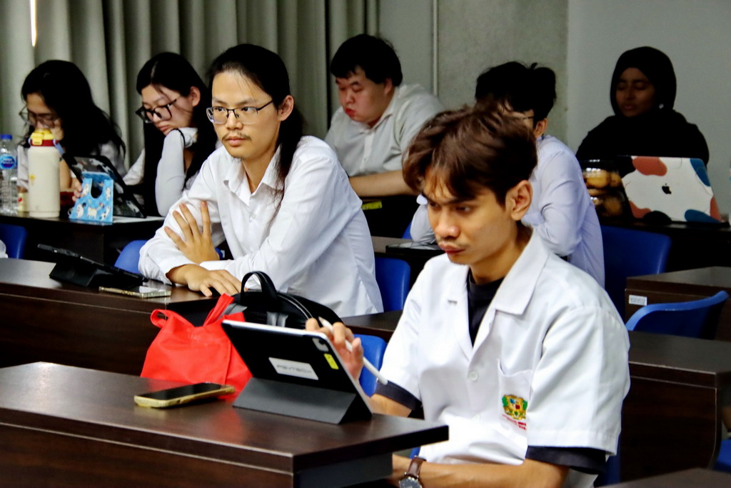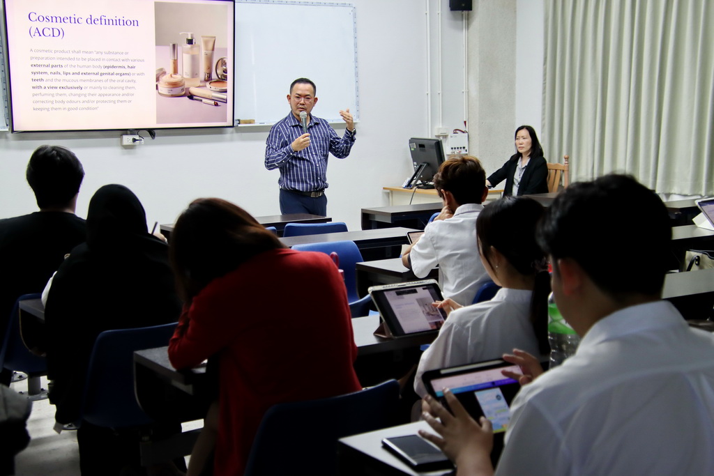 The lecture was delivered by Assoc. Prof. Dr. Veerawat Teeranachaideekul of the Faculty of Pharmacy, Mahidol University, whose expertise offered students a valuable window into how research and industry are converging in one of the fastest-evolving segments of applied science.
