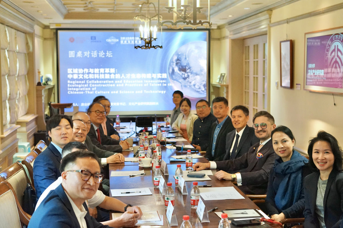 May 18, 2025, Beijing — Assumption University of Thailand (AU), in collaboration with the School of Arts and the Institute for Cultural Industries at Peking University, the UNESCO Chair on Rural Creativity and Sustainable Development, as well as leading domestic and international institutions including Renmin University of China, Communication University of China, Beijing University of Technology, Perfect World Holdings, China Huaxia Cultural Heritage Foundation, Migu Culture Technology Co., Ltd., Beijing Chuanhuozhe Artificial Intelligence Technology Co., Ltd., Gyeongsang National University (South Korea), University of Paris VIII, Anhui University, Sichuan Fine Arts Institute, China Academy of Art, Beijing Normal University, the Institute of Cultural New Economy at Shanghai University, and Jinan University, jointly initiated the “Global Alliance for Innovative Development in Culture and Technology Integration” roundtable conference.